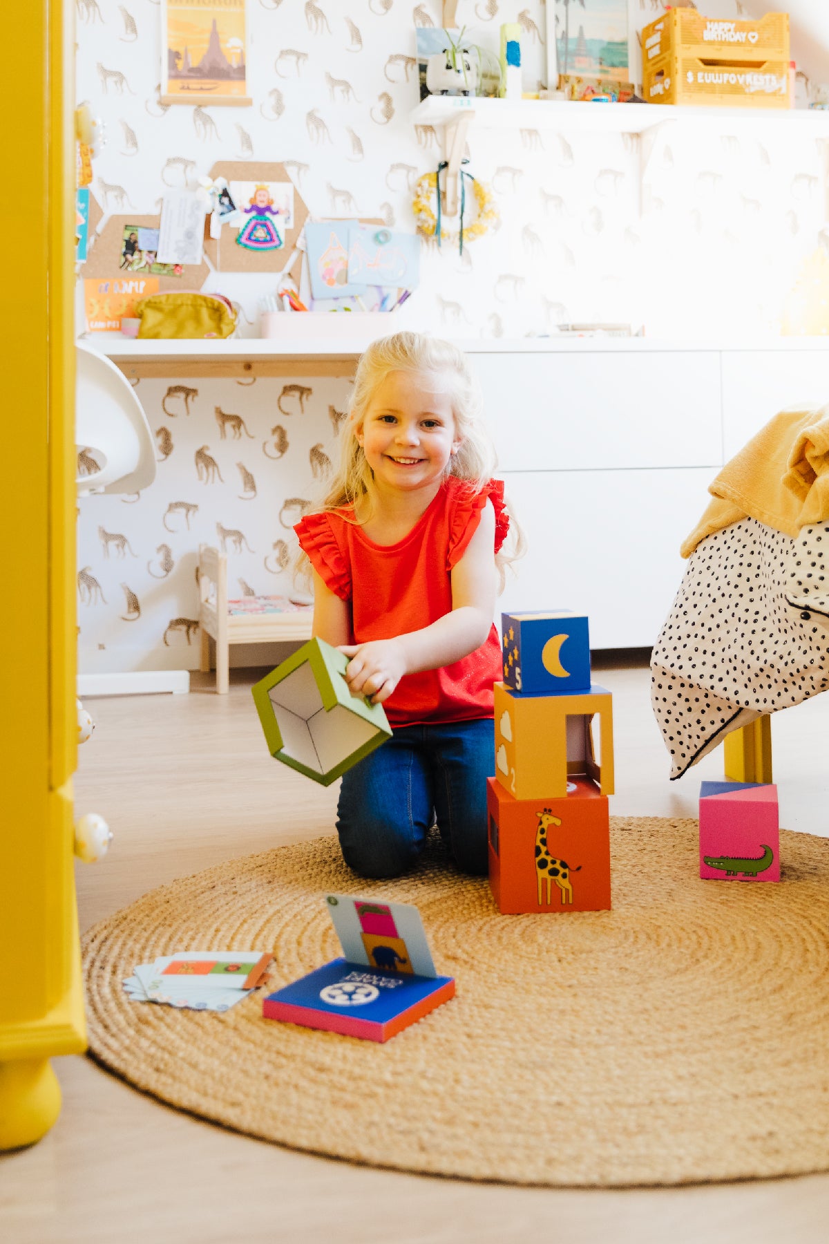 داخل الصندوق: 5 مكعبات من الورق المقوى، غطاء واحد من الورق المقوى، 48 بطاقة تحدي، نشرة تحتوي على الحلول