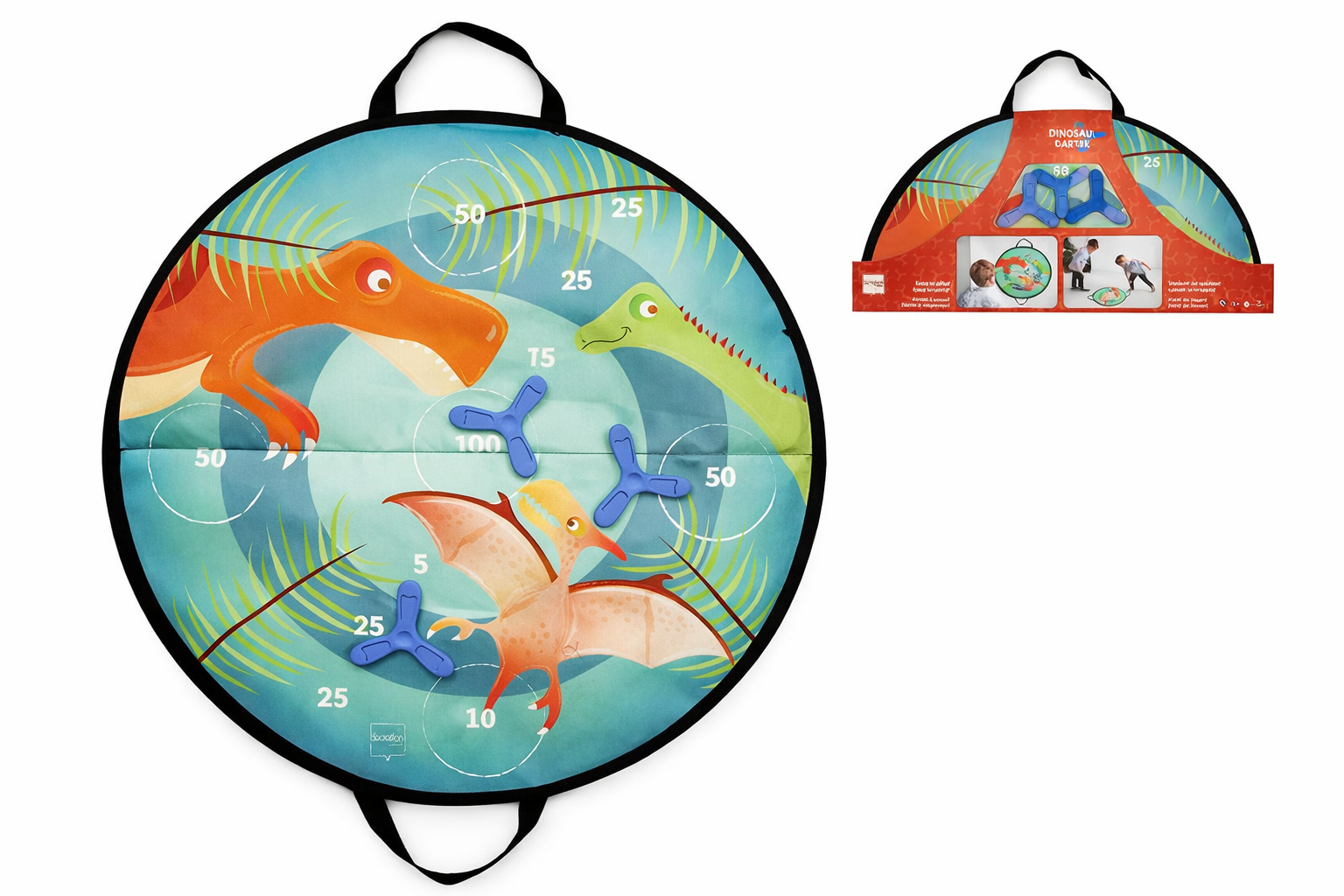 قم برمي أقراص السيليكون المغناطيسية على لوحة مستديرة للحصول على أعلى نتيجة ممكنة. ضع اللوحة على الأرض أو ثبتها على الحائط. يمكن اللعب بمفردك أو في مجموعة. تتكون المجموعة من لوحة مستديرة و3 أقراص. مقابض لوحة اللعبة تجعل من السهل أخذ هذه اللعبة معك. متعة لا نهاية لها مضمونة، في الداخل أو الخارج! مناسبة للأطفال من سن 3 سنوات فما فوق.