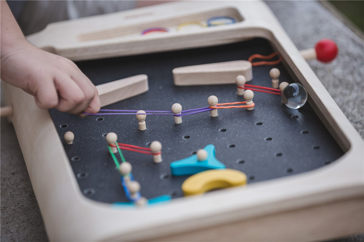 الكرة والدبابيس: استمتع بهذه الكرة والدبابيس الكلاسيكية! اسحب العصا الموجودة في الأسفل لإطلاق الكرة للأعلى، وحاول الاحتفاظ بالكرة في اللعب لأطول فترة ممكنة عن طريق الضغط على الأزرار الموجودة على كل جانب للتحكم في الزعانف وتوجيه الكرة عبر العوائق. يمكن للأطفال إنشاء المزيد من التحديات من خلال تعديل أوضاع طواحين الهواء والأوتاد الخشبية ووضع الأربطة المطاطية بطرق مختلفة. يمكنهم أيضًا تسديد الكرة إلى الشريط الأصفر، ثم سحب الأزرار الصفراء لإمالة الشريط والسماح للكرة بالسقوط مرة أخرى. (الأشرطة المطاطية متضمنة)
