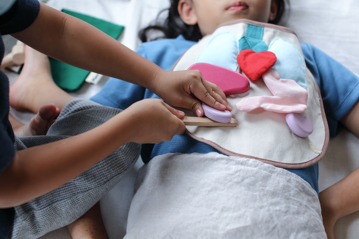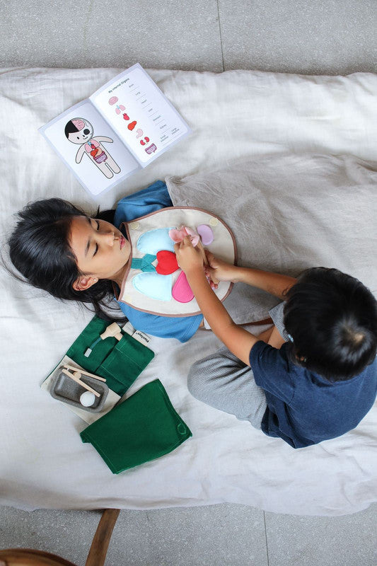 العب دور الجراح وتعرف على جسم الإنسان مع مجموعة الجراح! تشتمل مجموعة اللعب هذه على قطعة قماش تحمل علامات أعضاء مختلفة (القصبة الهوائية والرئتين والقلب مع زر تنبيه والمعدة مع قطعة من الطعام بداخلها والكبد والكليتين) وبطاقة شخصية للمريض تحتوي على مفردات بالداخل يمكن استخدامها للعب التظاهري الواقعي. مع الدمى والأصدقاء المحشوة. توجد أيضًا حقيبة تخزين لوضع المعدات الطبية المضمنة (مشرط وملقط وبراعم قطنية وستارة جراحية وقناع طبي وجهاز شفط وصينية PlanWood™). قم بتطوير المهارات الحركية الدقيقة والتفكير المنطقي ومهارات حل المشكلات والتنسيق بين اليد والعين والمزيد مع هذه المجموعة الفريدة!