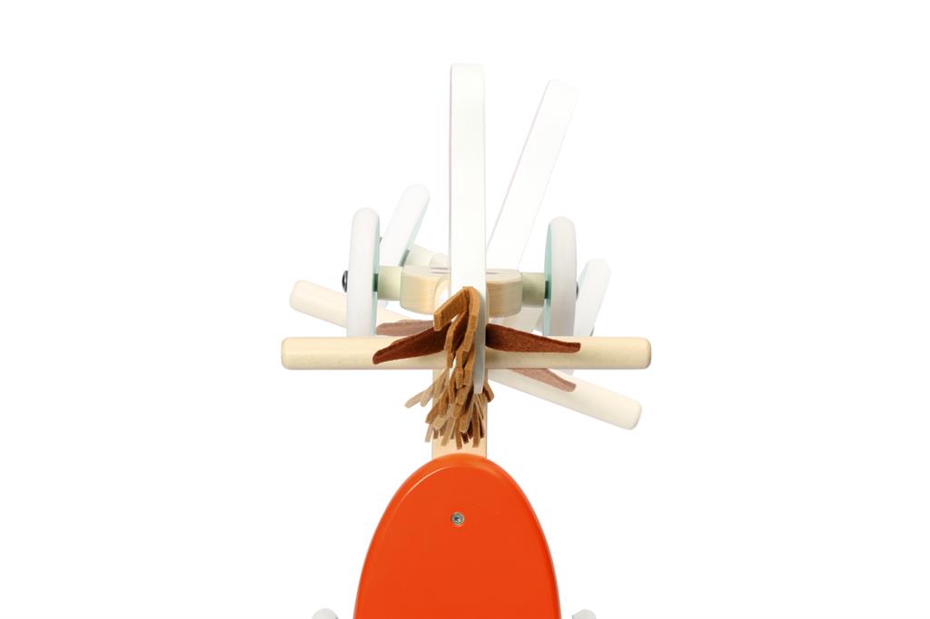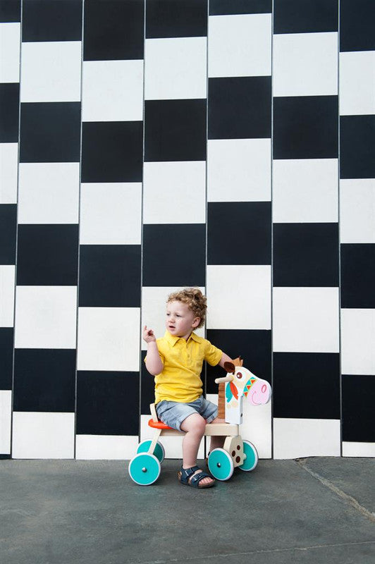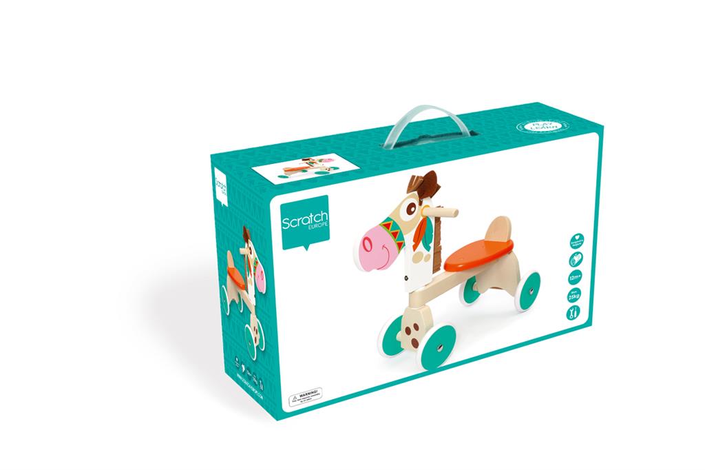 This tough four-wheel walker Indian Pony by Scratch was designed in Belgium. The bike is made out of high quality beech and has extremely quiet rubber tyres that leave no marks on the floor. The bike is very stable and has a limited steering angle. The handles are ergonomic so they are easy for little hands to take hold of. The wooden support at the back of the saddle will make sure children don’t slide off. Little ones will feel safe and have oodles of fun going on their first cycling adventures!