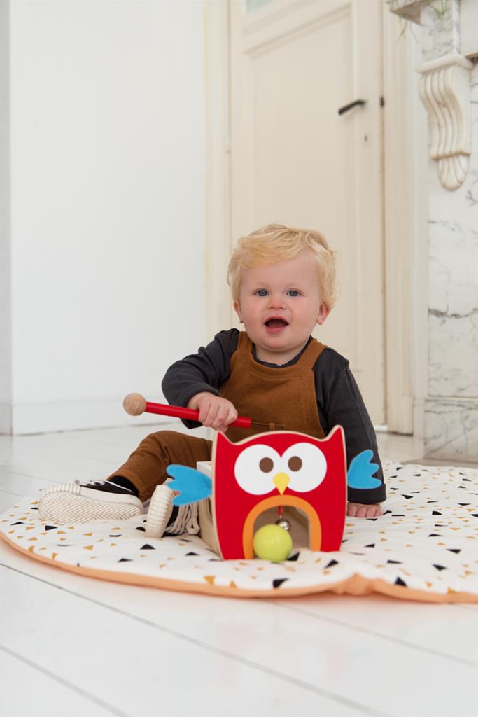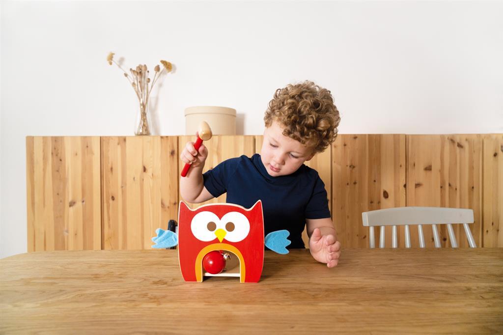“Toc toc”! Knock the coloured balls with the hammer and listen to the little bell ring! This colourful owl helps children to react faster while having lots of fun! Put the 4 brightly coloured balls on the right opening. Now knock the balls through the holes with the little wooden hammer and fun galore! This game helps children to grow familiar with different colours. Made out of wood with wings of felt.